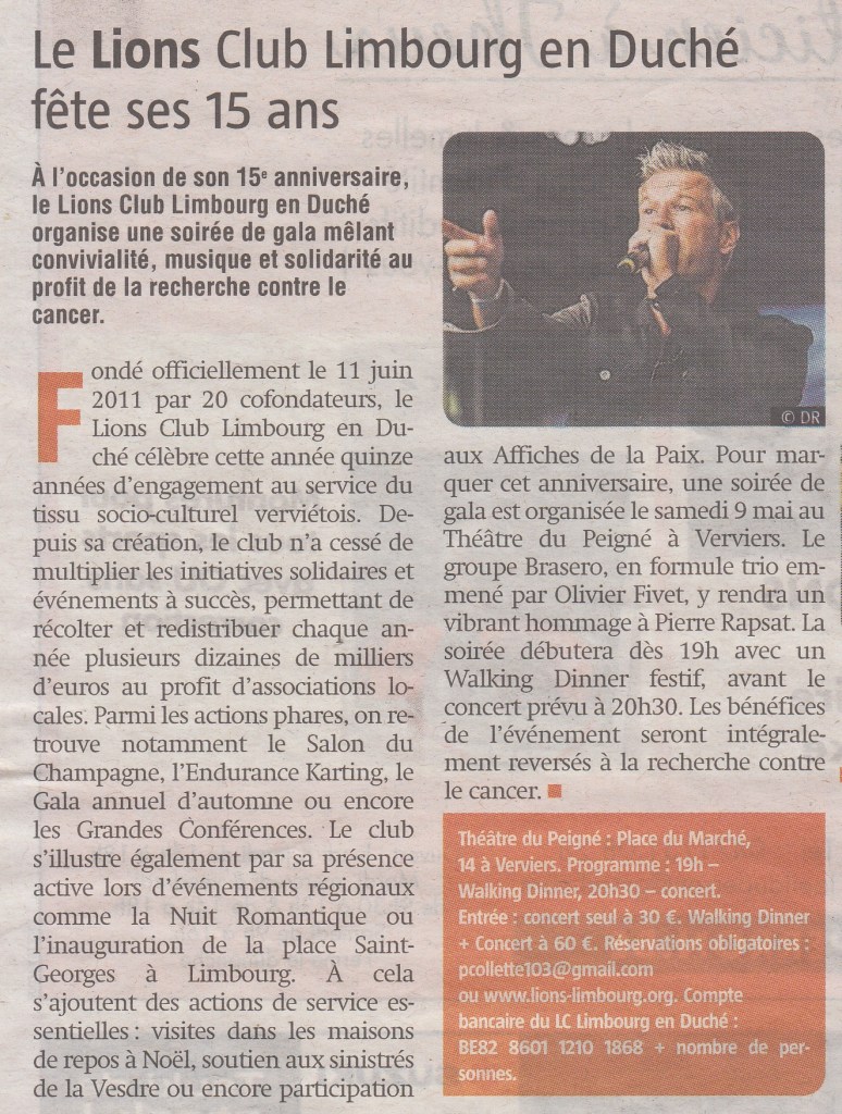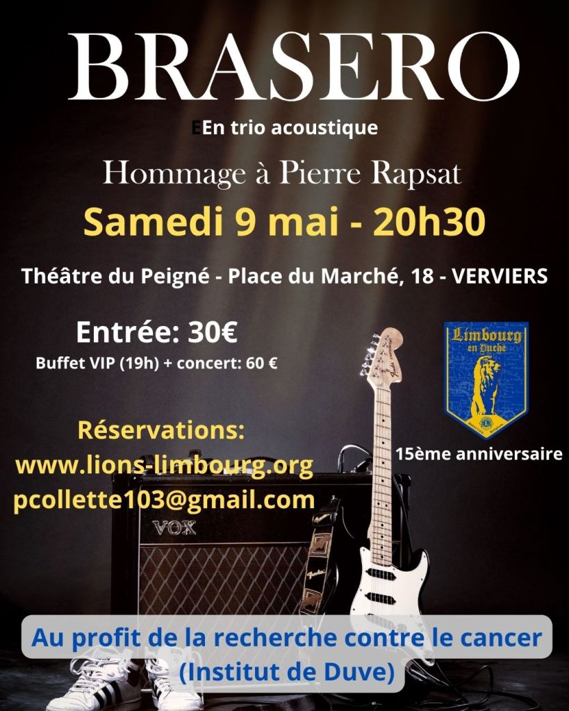 Le Club ne pouvait faire l’impasse sur ce 15ème anniversaire.Nous sommes donc heureux de vous inviter à notre concert anniversaire précédé d’un walking dinner (facultatif) avec BRASERO en trio acoustique au Théâtre du Peigné à Verviers, le samedi 9 mai.Nous espérons que cette invitation (cliquez pour l’agrandir) vous donnera l’envie de découvrir ou redécouvrir notre Club et partager avec nous cette soirée anniversaire.