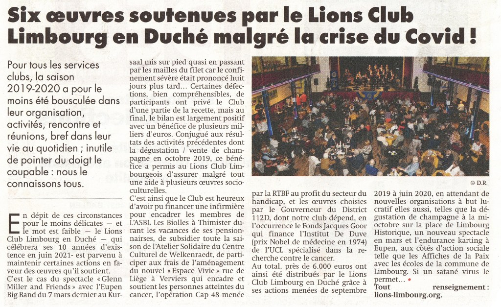 Le 25/7/2020, le Lions MD 112 a organisé à Malines la demi-finale et la finale du concours « LIONS European Musical Competition », qui est organisé chaque année au niveau National avec une finale Européenne à la clé.