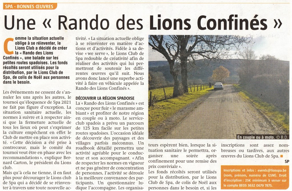 D’un point de vue Lions, ce qui est certain, c’est que … rien n’est certain ! A lire l’actualité, il est réaliste de dire que le premier semestre risque bien de ressembler à 2020. Notre créativité sera encore mise à rude épreuve, mais je suis convaincu que tous ensemble, nous y arriverons.