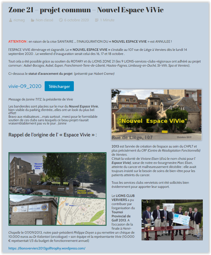 Depuis 2018, l’ensemble des clubs de notre zone 21 a œuvré de concert afin de soutenir l’ASBL Espace Vivie de Verviers. Ce soutien s’est traduit en dons, main d’œuvre, conseils et autres.