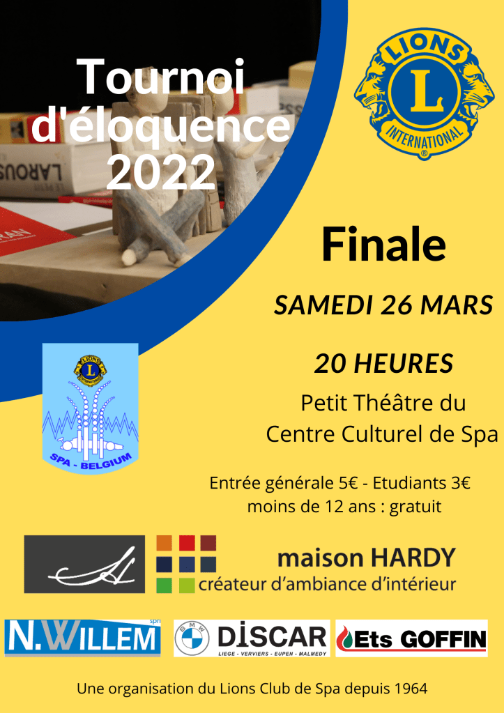 Spa – finale tournoi d’éloquence – sa 26 mars 2022 ricmag Non classé 21 février 20222 avril 2022 1 Minute Réservations via la page facebook du tournoi : https://www.facebook.com/eloquence.du.Lionsclub.Spa J’aime chargement… Sur le même thème Publié par ricmag Voir tous les articles par ricmag Publié 21 février 20222 avril 2022
