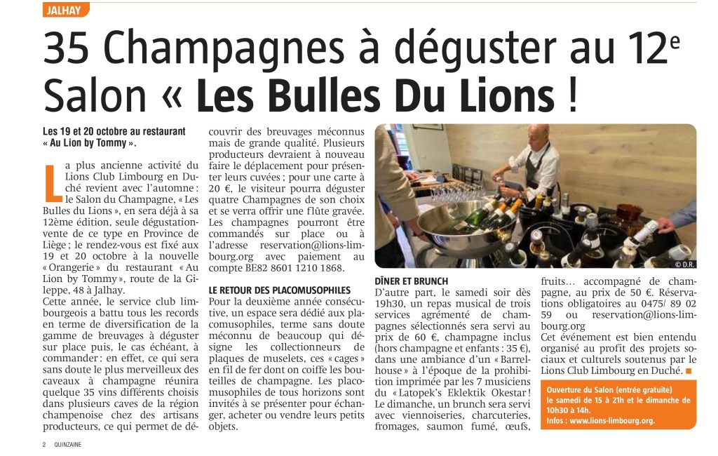 Liombourg en Duché – 12ème Salon « Les Bulles du Lions » – sa & di 19 & 20 octobre 2024