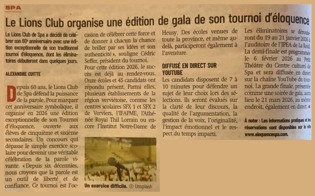 Spa – Tournoi d’Eloquence -19 au 21 jan + 6 fév + 21 mars 2026 ricmag Non classé 21 janvier 202621 janvier 2026 1 Minute Article-Lavenir-2026-01-17Télécharger J’aime chargement… Sur le même thème Publié par ricmag Voir tous les articles par ricmag Publié 21 janvier 202621 janvier 2026